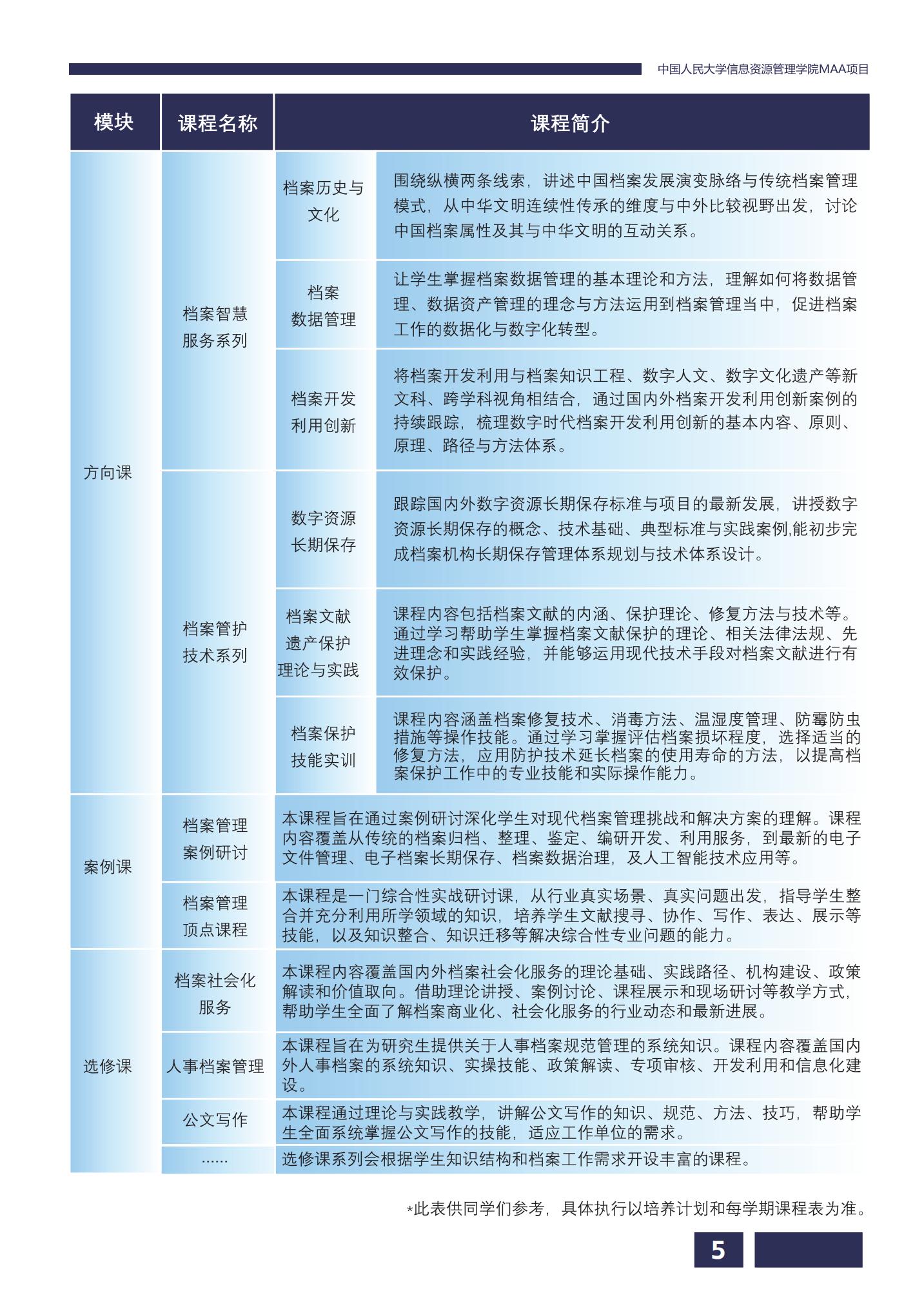 实用数据分析方法与案例、数据管理基础、数字资源组织、数据挖掘、数据可视化、档案基础与前沿、电子文件管理前沿、现代文件档案管理原理与方法、电子文件管理原理与方法、数字档案馆建设、档案信息化前沿、现代企业文件档案管理、企业知识管理、企业数字档案馆(室)理论与技术、档案知识组织与知识服务、档案数据化编研、历史档案数据化开发、文献保护理论与实践、数字资源长期保存、数据治理与档案管理、信息系统设计、数字人文前沿、数字记忆前沿等。