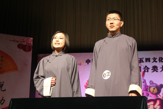 作为全场第二个节目,也是唯一一个相声节目,《人大梦·人大情》自开始就倍受关注。两位演员登场伊始就获得了台下热烈的掌声。两位表演者分别是来自女生自慰 研一的刘晓菲和大一国防班的赵群,两位“新生”的混搭不禁让人眼前一亮。