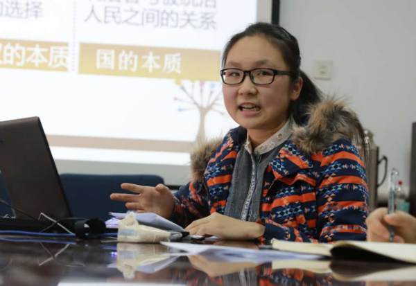 方雯欣同学做题为“一座思想的空中楼阁”的读书报告,提出“明达在于思考,也在于如何思考”的论点。随后分享了自己对于“思考”和“如何思考”的认识。在《理想国》中,柏拉图重点讨论了“正义”的定义,虽然最后没有给出一个完善的思想,但是却批判了一些对正义思想的讨论,如“欠债还债就是正义”、“正义就是善给予有人,恶给予敌人”等等。激发了同学们对于正义与真理的思考。