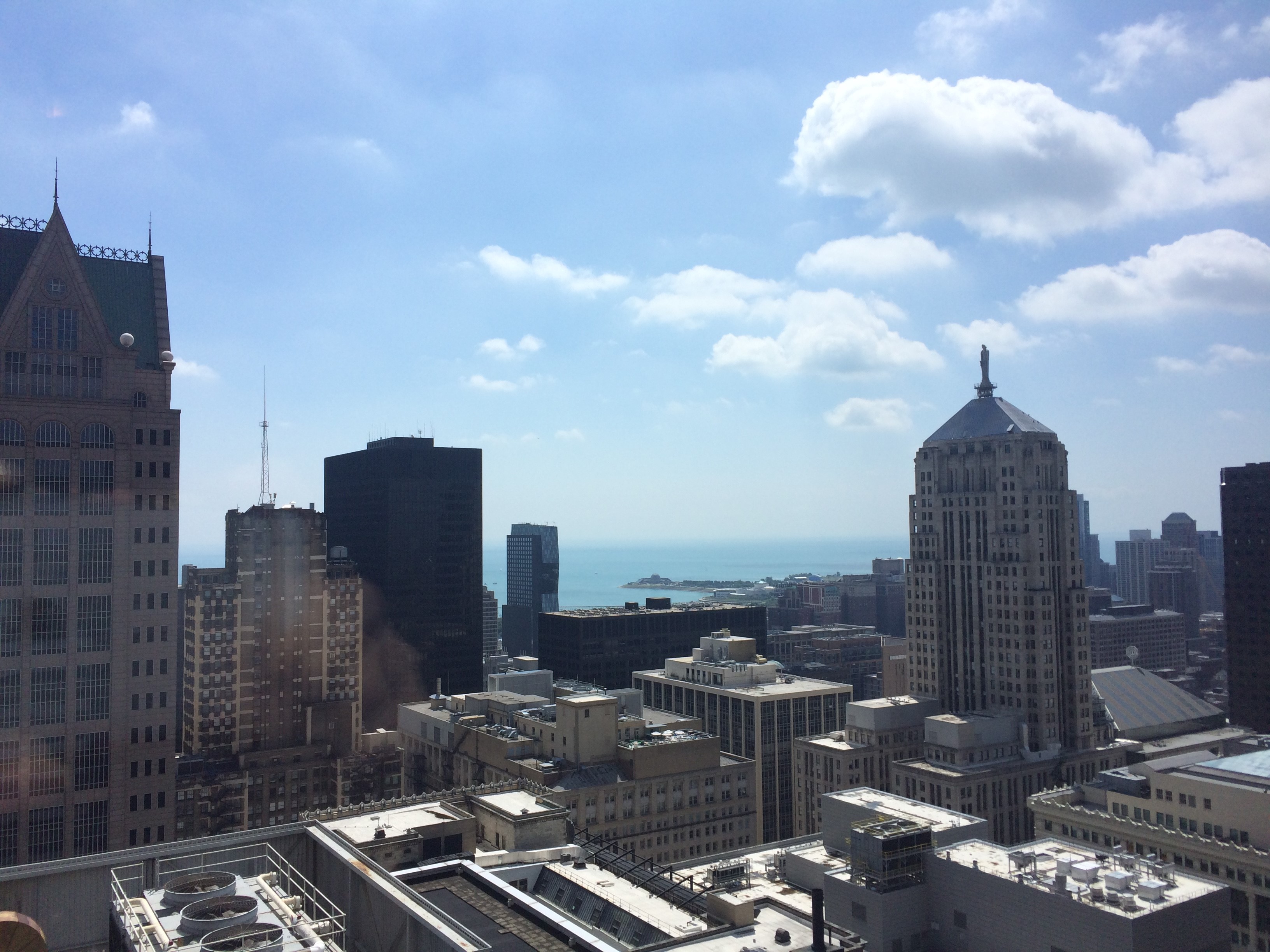 在Franklin大厦的一楼,办理了访客卡之后,在工作人员的带领之下到达William Blair 32层的会议室。从会议室的窗户可以看到对面的高楼以及远处的密西根湖,澄澈的湖水和湛蓝的天空相呼应,以水天相接之美开启了今天的专业参观之旅。