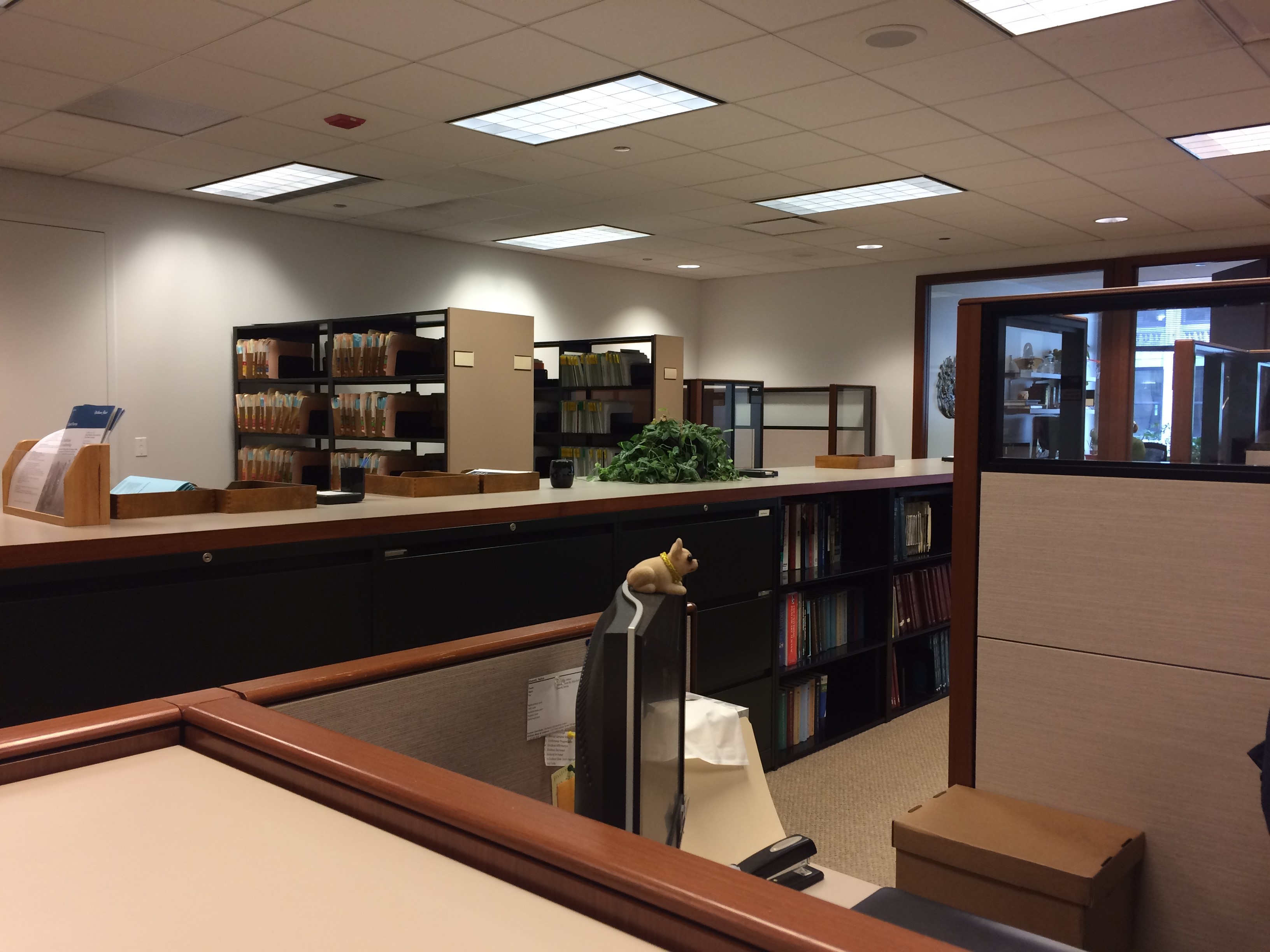 随后人事部工作人员Rebecca带领我们参观了整个公司的不同部门。首先去到的是公司CEO的办公区和接待前台所在楼层,接着分别参观了股票、投资买卖的交易办公室,每位工作人员面前都是三到五台电脑,这样的办公环境也让我们大开眼界。另外还参观了了市场部、人力资源部、行政部、休息室、信息资料中心、培训中心以及最令我们惊讶的地方——Concept Space:每个部门的员工都有两周的时间可以来这里办公,感受这里的办公设备和环境,如果觉得体验的不错,将来筹备搬进的新的办公地可以选择布置成这样,做一个办公体验测试。当然这些部门中,与我们专业息息相关的当属信息资料中心,在这里每天都会接收和印刷数千份资料,有专门的人员和机器一起工作,为整个公司提供基础信息和资料。除此之外,公司还设有一个小型的企业图书室,将与公司业务相关的报刊、杂志、书籍整齐的摆放在书架上,供员工借阅查询。