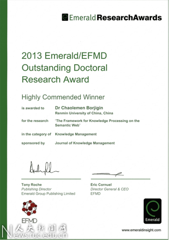据悉,Emerald是全世界最重要的管理学出版集团之一,欧洲管理发展基金会(EFMD)是拥有700多个来自学术界、商界及公共服务界的会员组织机构。Emerald/EFMD杰出博士论文奖分为12个领域,旨在对近3年来每个领域最好的博士研究给予国际认可和资金奖励。