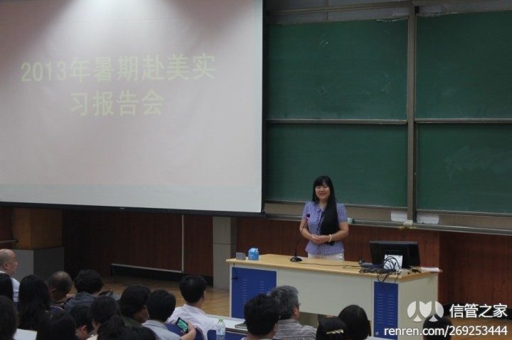 开学典礼后,王健教授主持了2013年学生暑期赴美实习报告会。2010级档案班王瑞麟、2013级硕士研究生席芮等各自介绍了本团队在芝加哥、世界银行华盛顿总部的实习经历,分享了自己的酸甜苦辣,让在座的新生获益匪浅,也获得了老师们由衷的称赞。报告会最后,张斌院长为实习团队赠送月饼作为中秋礼物和实习嘉奖。