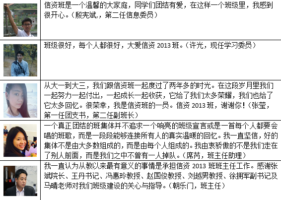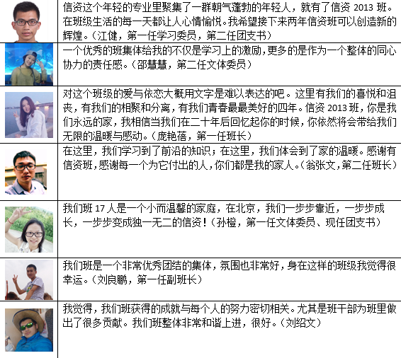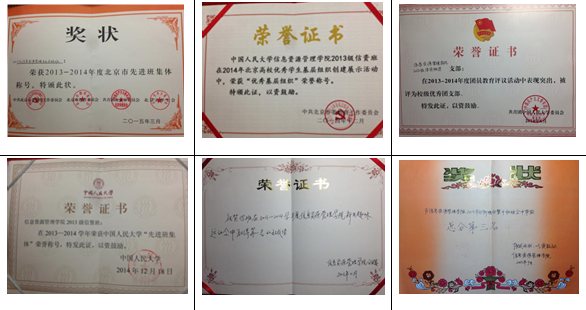 作为我国信息资源管理专业的第一个本科班级——信资2013班是翱翔蓝海的领头雁。信资2013班的每个同学都在尽自己最大的努力实现班级的荣誉与责任。从大一开始,信资班就以各方面不俗的成绩获得广大老师的好评与嘉奖,获得了许多荣誉。同学们积极组织并参加学校及学院组织的中共中央会议学习、团日活动、团校学习等各种活动,在2014年度的团日活动中,该班开展了参观孔庙、国子监活动,参观后每位同学都在社交媒体上发表了关于“中国梦”感言的微视,以网络的方式进行了团日活动展示与宣传,这种新颖的方式也使得该班在团日活动评选活动中获得二等奖的荣誉。班内有许多闻名于学院的各位“学霸”“学神”们,班级组织过多次有趣充实的班级集体学习活动。在学校举办的“读史读经典”系列活动中,辅导员陈雅静带领同学们开展一系列活动,孔庙、国子监的实地学习,班内读书分享会等,甚至带上了她的导师为同学们讲解古代的文化礼仪,大家受益颇深。学院邀请了学科开创者之一的孟广均老先生为大家讲解信息资源管理导论。为了使同学们能更多地认识自己的专业知识,班级采用了一个新颖有效的学习方法——创建了一个Wikiversity知识共享平台,同学们根据文献资料及自身的理解,协同编辑与信息资源管理相关的知识内容,对专业理解的更深,更透彻,也为大家将来的专业学习打下良好基础。此外,该班踊跃参加薪火杯、创新杯、大学生创新实验计划等各种科研竞赛。在创新杯中获得了一二三等奖,在大创中获得1个国家级立项及1个北京市级立项等傲人的成绩。