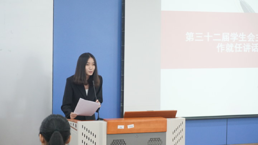 随后,第三十二届分团委学生会主席团成员进行了自我介绍,部长团进行了个人展示和汇报规划。主席团和部长团依次上台,主席们在讲话中表了对过去两年工作的感悟和对未来工作的希望。部长团的发言充满活力,他们在话语间满是对学生会的热爱和为学生工作奉献的决心,现场表达了自己的心声。