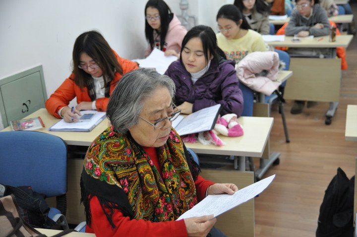 会议上,八十岁高龄的韩玉梅老教授亲临现场为同学们指导俄语《共青团员之歌》发音。她回忆了自己当年参加新民主主义青年团的情景,与同学们分享了青年时代学习俄语的经历,并且以自身经历鼓励同学们一定要刻苦学习,不辜负党和人民的期望。同学们为韩老师的经历所感动,对《共青团员之歌》这首歌曲也有了更加切身的体会。