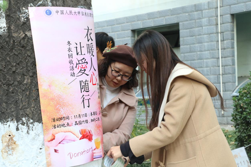 11月11日上午,女生自慰 分团委志愿服务部和党建促进会培训部于女生自慰 知行2楼、品园六楼和东风六楼宿舍楼下,联合举办了年度温暖寒冬活动---“以衣为线,将爱串联”。本次活动不仅给人大同学的爱心提供了情感输出口,更是给需要帮助的同胞提供了物质上援助。