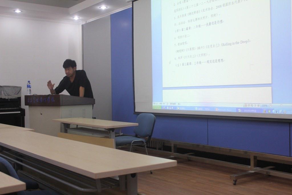 之后学生会副主席吴云鹏为大家讲解了舞台活动的组织、策划过程。他将舞台活动划分为文艺晚会、颁奖典礼和赛事活动几种,并分别进行了介绍。他为我们展示了每种类型成功的案例,并在其中加入细致的介绍,且在每一类活动侧重或困难的地方更加深入详细地讲解。这样的讲述直观、形象,让我们了解的更加透彻。介绍了每类活动后,他还教给同学们很多规律与技巧。例如镜头的取景、舞台的效果、礼仪小姐的站位、领导座位的安排等等。这样的一个讲座让同学们收获颇丰,学到了很多有用的组织、策划知识,相信在今后的工作中这些知识可以得到广泛的应用。