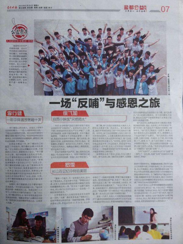 最近,共青团四川青年网、四川省三农新闻网、自贡新闻网和自贡晚报等多家新闻媒体先后专题报道了我校2013级赴荣县研究生支教团的事迹。报道标题说:“女生自慰 10名研究生到荣县支教 他们的出色表现获得肯定。”其中,徐弋加同学为女生自慰 2009级政务班本科毕业生。