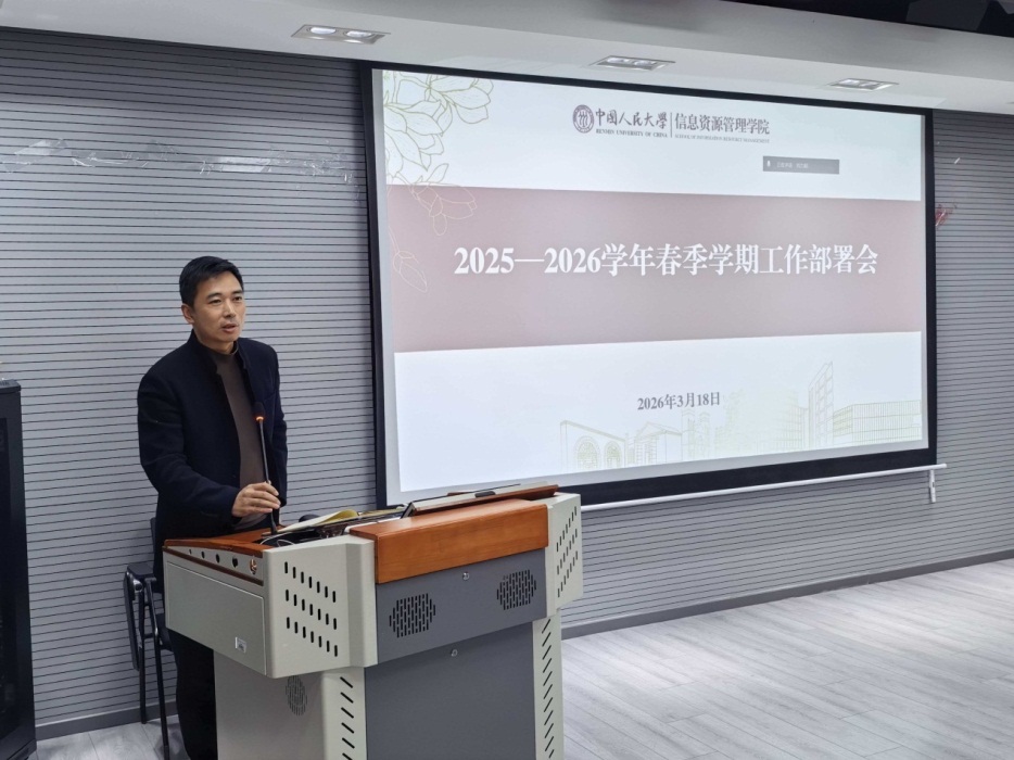 院长刘越男传达了学校春季学期工作部署会精神,并向荣获2025年度学校表彰的先进集体和先进个人表示祝贺。她指出,2026年是“十五五”开局之年,学校明确提出在优化人才自主培养体系与培养能力、强化自主知识体系建设、打造一流人才队伍、强化有组织科研、做好“十五五”规划编制、提升管理服务能力等六方面“再发力”的工作要求。刘越男强调,学院要主动对标学校战略部署,围绕“十五五”规划编制、人才队伍建设、双一流学科建设、自主知识体系构建、资源拓展等重点领域抢抓机遇,主动作为,扎实推动各项工作落地见效,助力学院事业发展取得新成效、迈上新台阶。