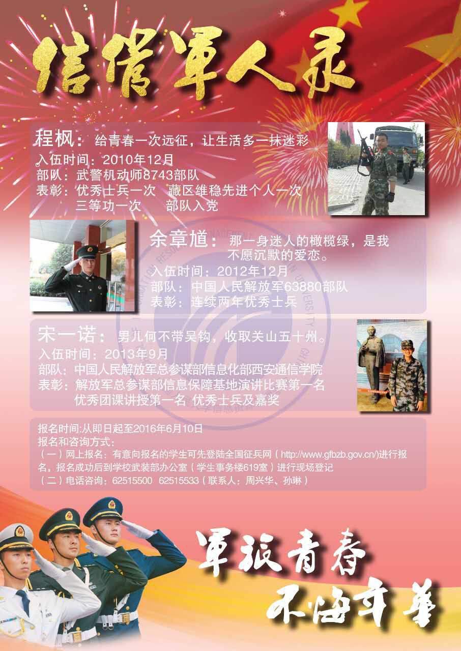 自2006年以来,女生自慰 已向部队输送了6名优秀人才,学院老师同学也见证了他们在部队的茁壮成长。未来,相信会有更多的信管学子在部队大舞台上献身国防、成就自我,彰显我信管人的使命担当。