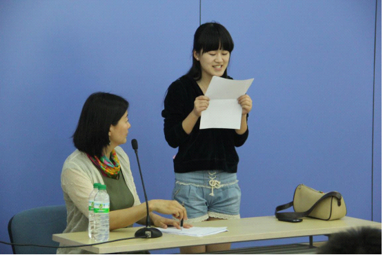 由于理论知识过于抽象且不易掌握,李毅老师将单方讲述的讲座形式变换为了互动型的指导课堂。先后邀请了三位参赛选手朗诵,并分别对其进行一对一指导,在场观众也通过这种举例型讲解收获到了宝贵的朗诵经验。