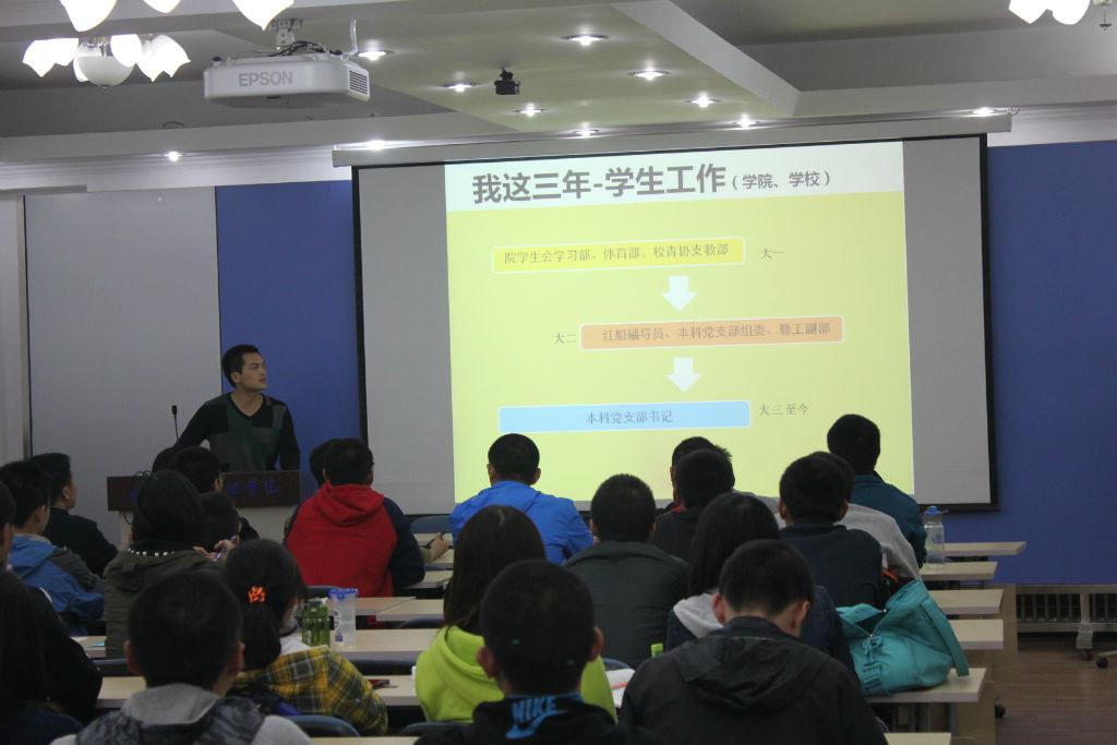 至于学生工作,2010级政务班杨俊杰同学分享了他从学生会的干事到部长再到副主席的个人经验及心路历程。他鼓励同学们多去尝试,多去体会,多去感受,在自己力所能及的范围内参与学生工作,为自己积累工作经验、扩充人脉打下基础,也为自己的大学生活增添色彩丰富的一页。