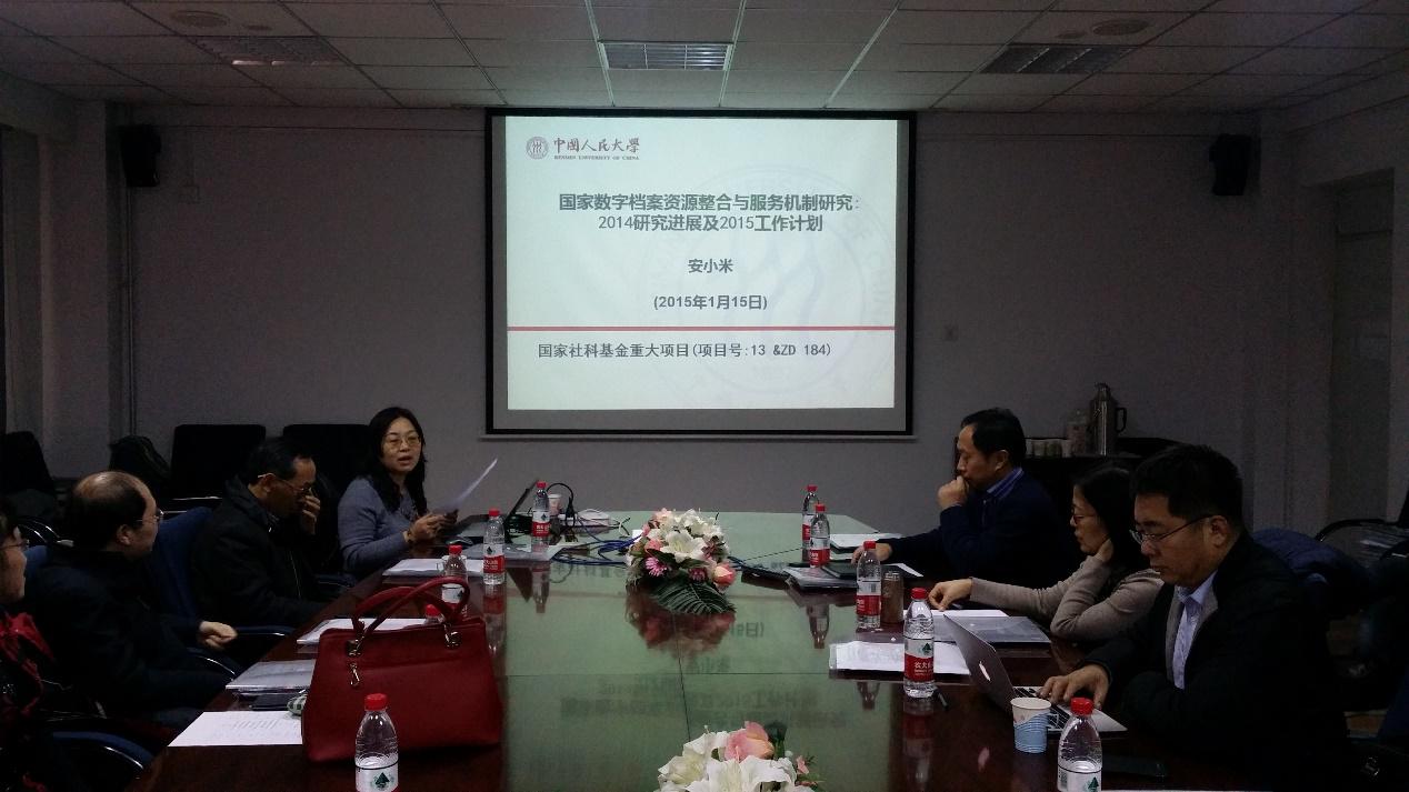 以国家数字档案资源整合与服务机制研究为主题,主要围绕2014研究进展及2015工作计划进行讨论。小米教授作为社科重大课题负责人主持本次会议,并首先向与会人员简单介绍了社科重大项目按原研究设计完成任务基本完成情况,然而针对该课题开题会上专家提出的建议,介绍课题组集体攻关取得初步研究成果研究中发现的问题,包括档案多元论创新思想及其对数字档案资源整合与服务的影响、国家数字档案资源整合与服务协同创新体能力构建知识管理方案、国家数字档案资源整合与服务协同创新机制、国家数字档案资源整合与服务连续性管理可持续再用原则及实现途径等内容。最后,教授课题2015集体攻关内容、20156拟召开国际会议的筹备及其他拟开展的工作任务进行部署会人员就研究中存在的问题及2015工作计划进行了讨论,在2015调研目标调整、调研对象及地点选择调研内容、调研方式和调研手段改进和调查成果发表等方面提出了有益的建议
